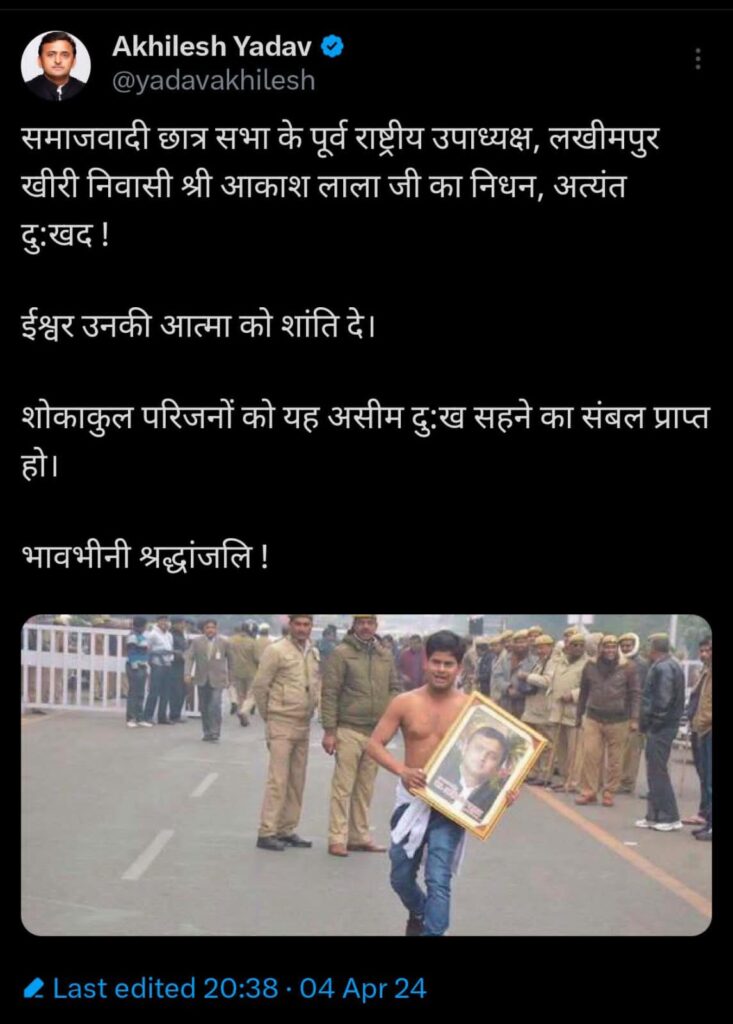 लखनऊ/ लखीमपुर खीरी। समाजवादी छात्र सभा के पूर्व राष्ट्रीय उपाध्यक्ष आकाश लाला ने अपने घर के कमरे में फांसी के फंदे से लटक कर जान दे दी, वह लखीमपुर खीरी के गोला गोकर्णनाथ कस्बे के रहने वाले थे. आकाश लाला पूर्व मुख्यमंत्री स्वर्गीय मुलायम सिंह यादव और अखिलेश यादव के गरीबी माने जाते थे, आकाश लाला के निधन पर समाजवादी पार्टी मुखिया अखिलेश यादव ने एक्स समेत प्रमुख सोशल प्लेटफॉर्म पर साथ ही पार्टी के आधिकारिक हैंडल से भी आकाश लाला के निधन पर शोक व्यक्त किया गया है.